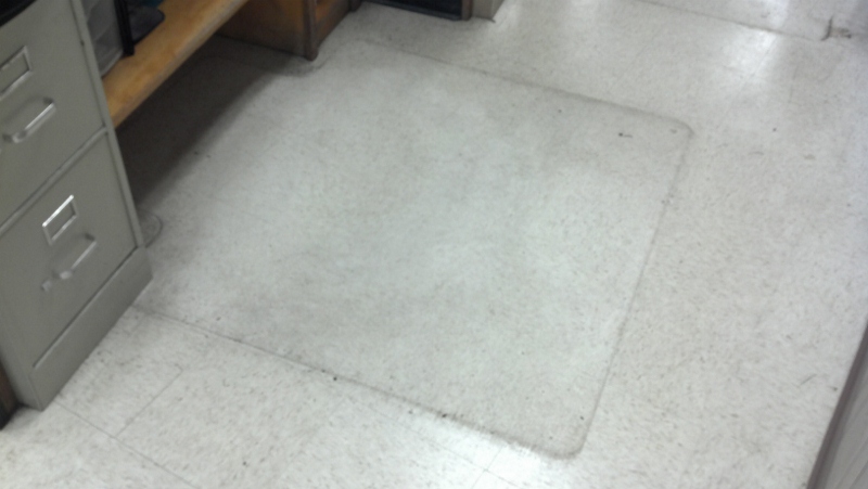 A very worn counter workspace area. To repair this floor it not only needs the wax and stripped off, but it also needs to be scrubbed before the new wax is applied. Posted on September 3, 2012 by Simply